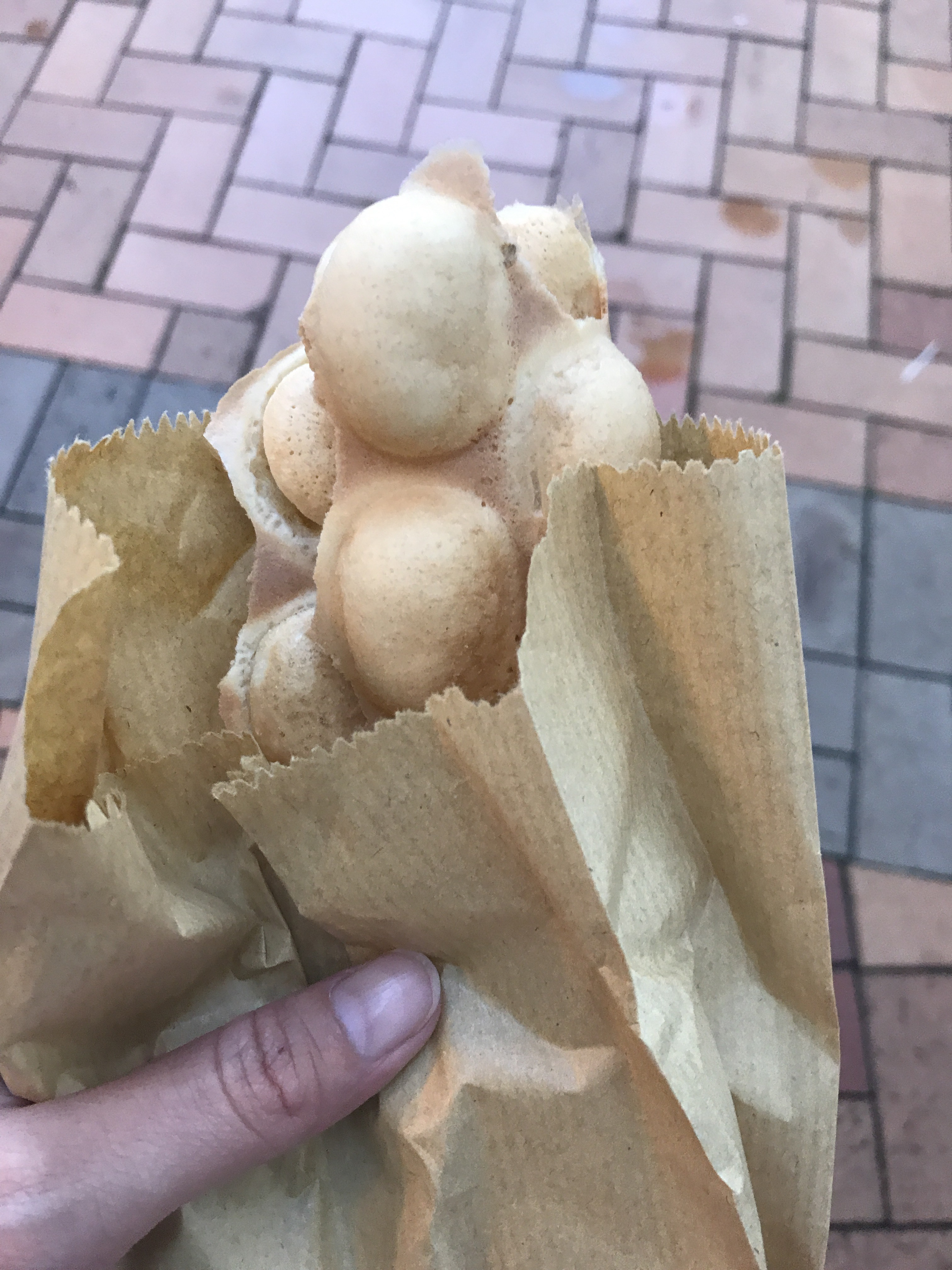「要快D食」爺爺邊叮嚀著怕雞蛋仔冷了,邊拿出牛皮紙袋把雞蛋仔裝進去,那紙袋讓我想起龍潭市場的麥餅。