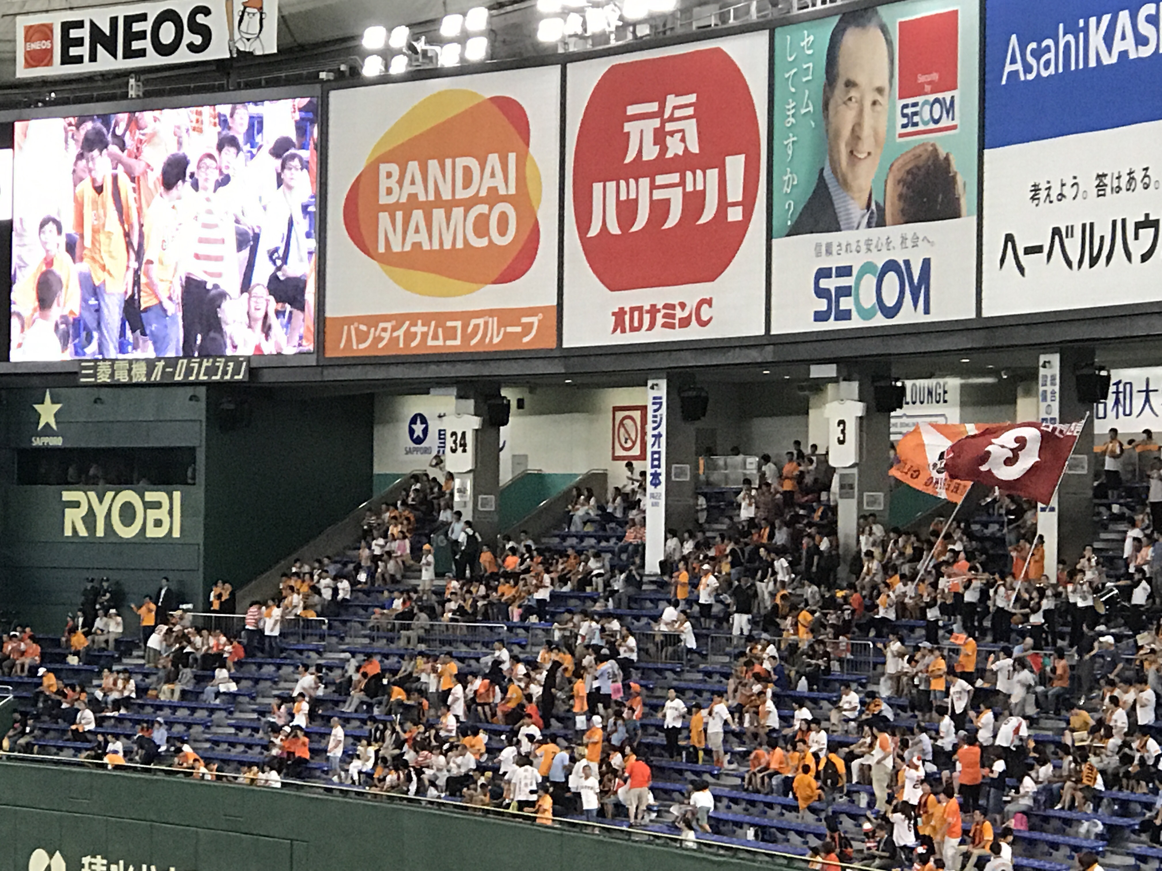照片下方的日本妹是販售啤酒的工作人員喔,覺得他們很辛苦,要背著很重一大桶的啤酒來回穿梭上上下下樓梯,有人舉手她們就會過去側蹲姿態倒啤酒,桶子空了還要去球場後方補給再出來販售,美麗的妝容早已充滿了汗珠。