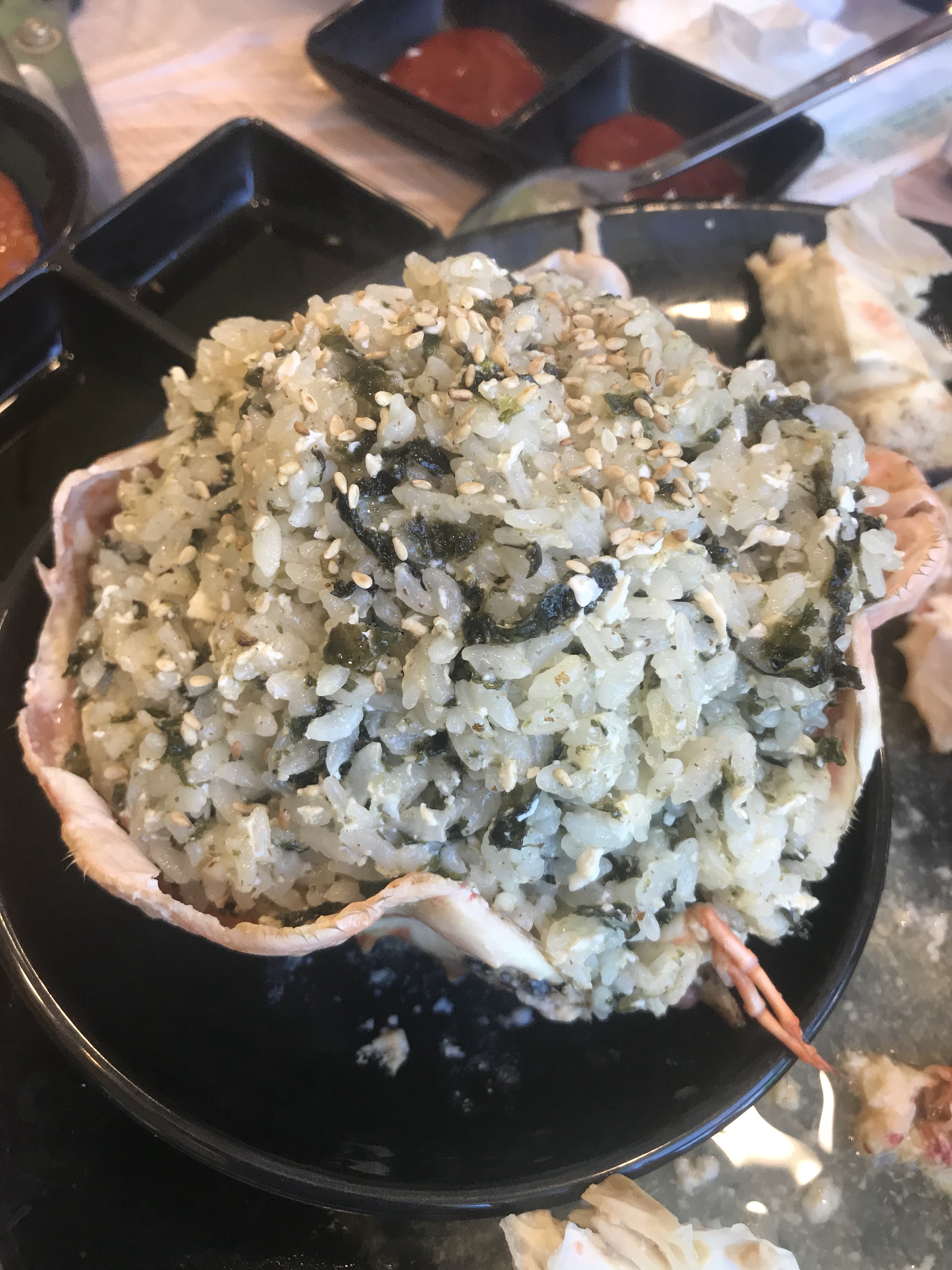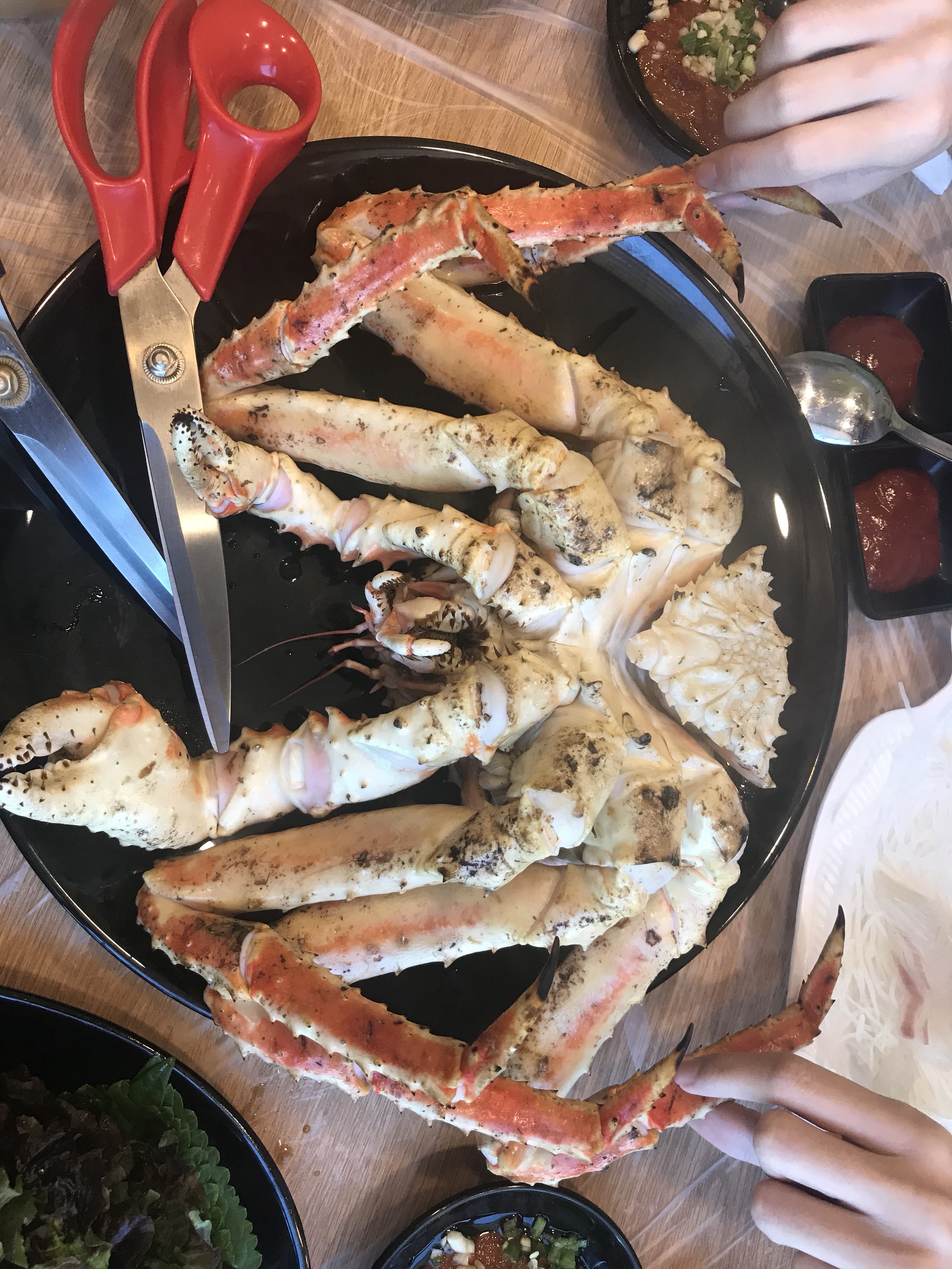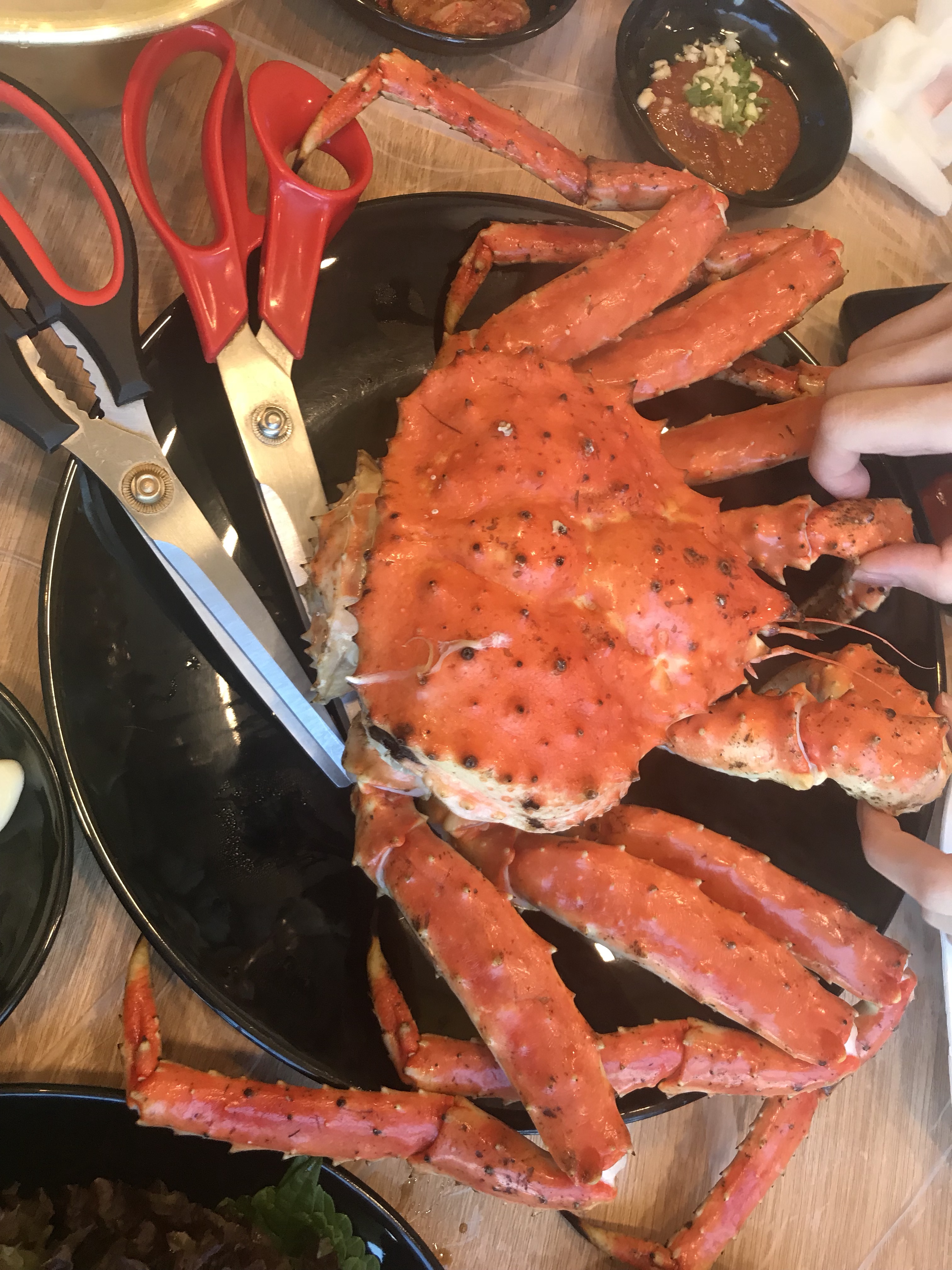 重頭戲帝王蟹終於來了!!!!其實這一隻三人吃還是有點不夠味,下一次要選更大隻了,這一隻是大約6萬韓圜,光是剪螃蟹跟撥開吃就花很多時間,東北大媽一看我們就是吃蟹苦手,還過來教學如何輕鬆吃螃蟹。