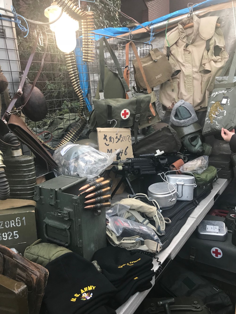 市集裡各種東西都有,有精緻的餐具、杯子,也有手工藍染,舊的農作用具、電鑽、有歷史感日軍的外套、軍帽、war game迷彩道具攤、古錢、瓷器。