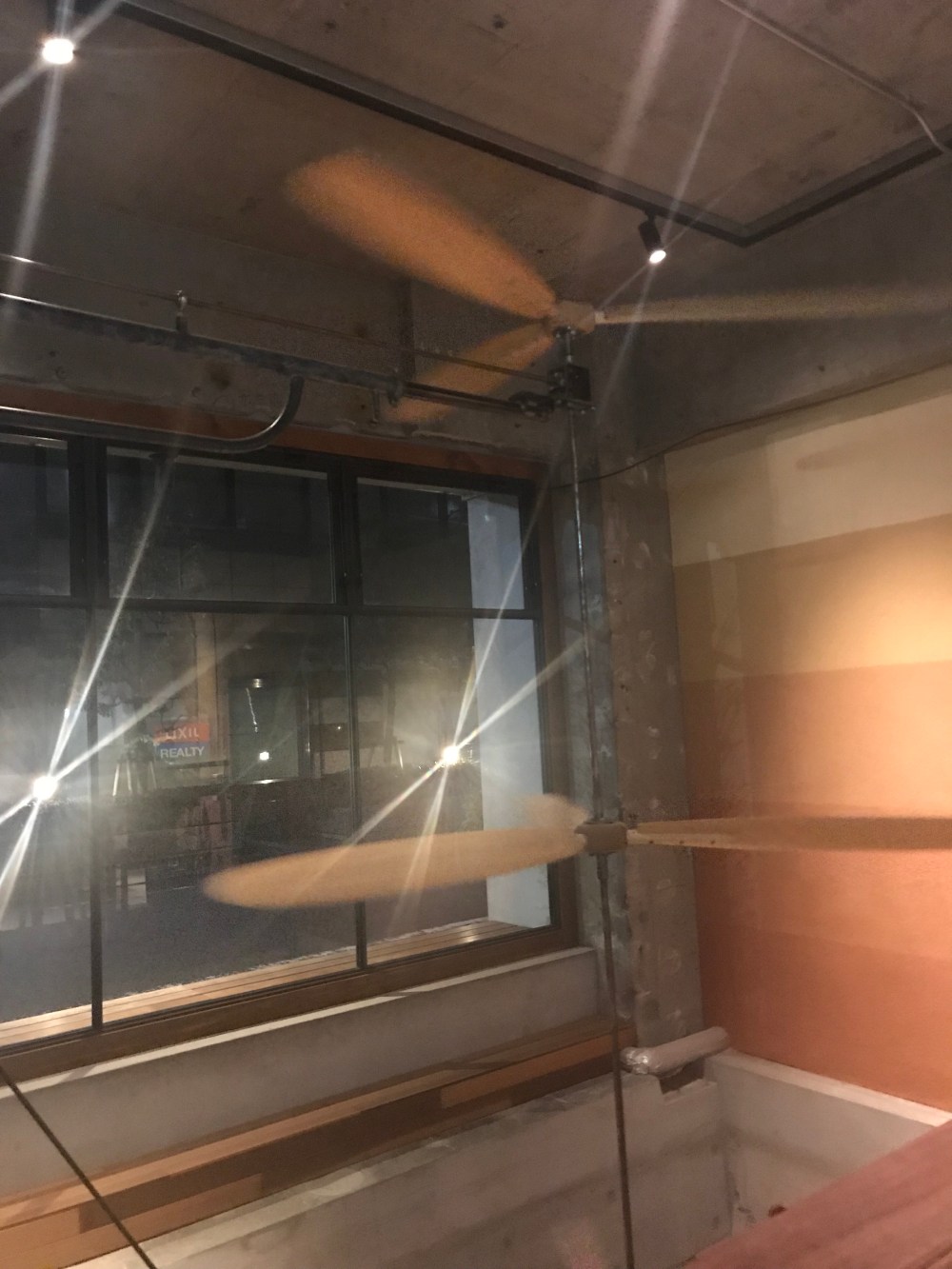 夜晚,Reception 旁的咖啡店座位可以看見地下室的酒吧,隱隱約約傳來店員與客人的聊天聲,播放著屬於夜晚的音樂,抬頭看著天花板上轉呀轉的復古的大風扇,有股獨特的風味。