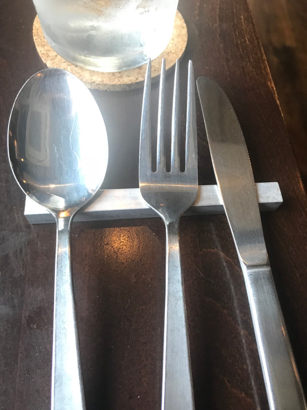 點好餐之後,店員會送上杯水與餐具,餐具架很特別,以為很重是鐵製,其實很輕,應該是鋁製。