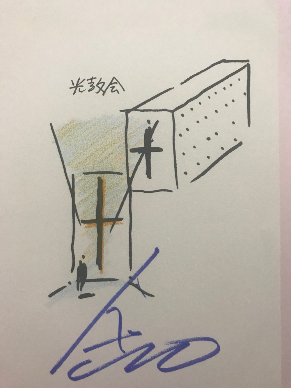 所有展區結束後,最後當然會有商品販賣區,特別的是有賣安藤忠雄為了這次展特別準備的簽名書哦,每本書的前面都有親筆簽名與建築的插畫,每一本的簽名與圖都不太一樣,我選了有光之教堂的簽名,希望未來真的有機會親眼看到本人。