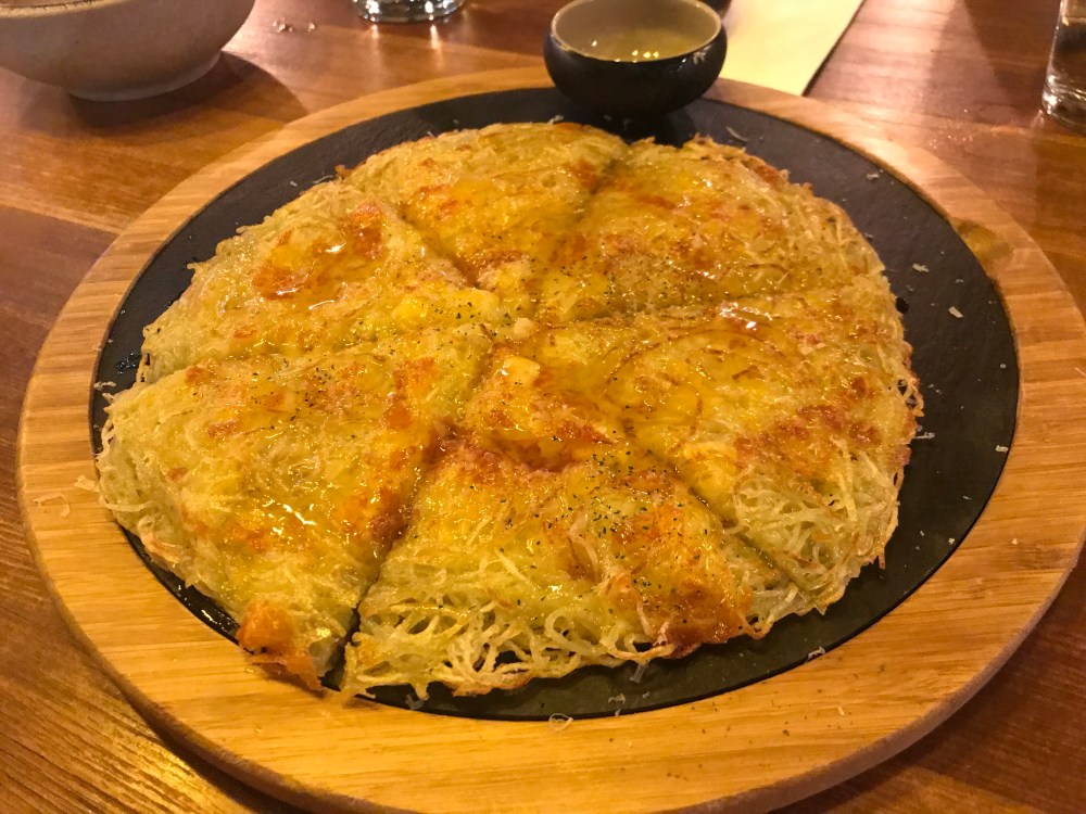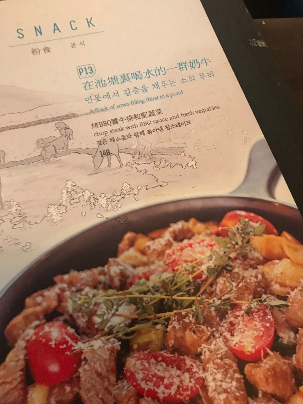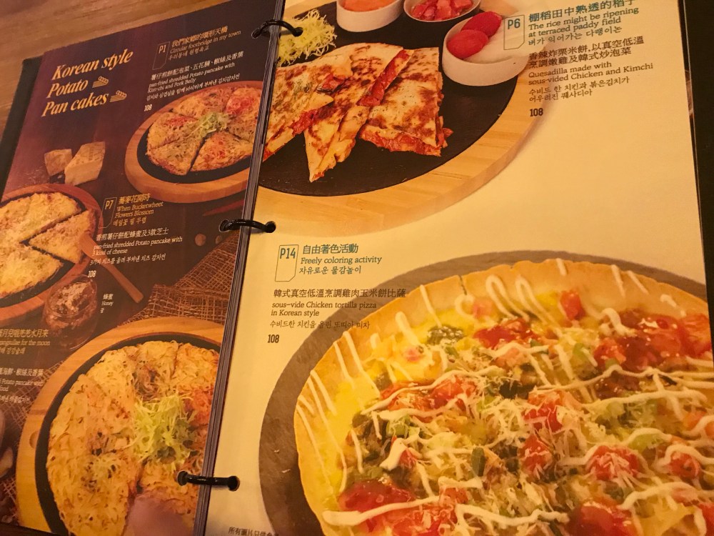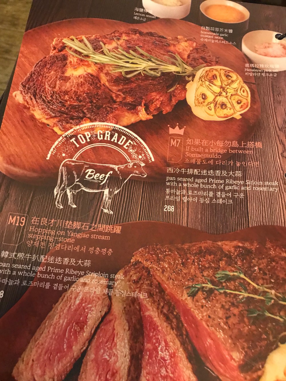 韓國大叔非常熱情而詳細點的介紹推薦他們的餐廳,是一個走fusion 風格的韓國菜,有傳統的石鍋、煎餅、泡菜類,竟然也有牛排、漢堡、火鍋,菜色看起來都很特別,連名字都非常文青,於是我們就跟著韓國大叔進入這家誤打誤撞卻意外好評的餐廳,據說老闆是曾經在美國生活的韓國人喔。