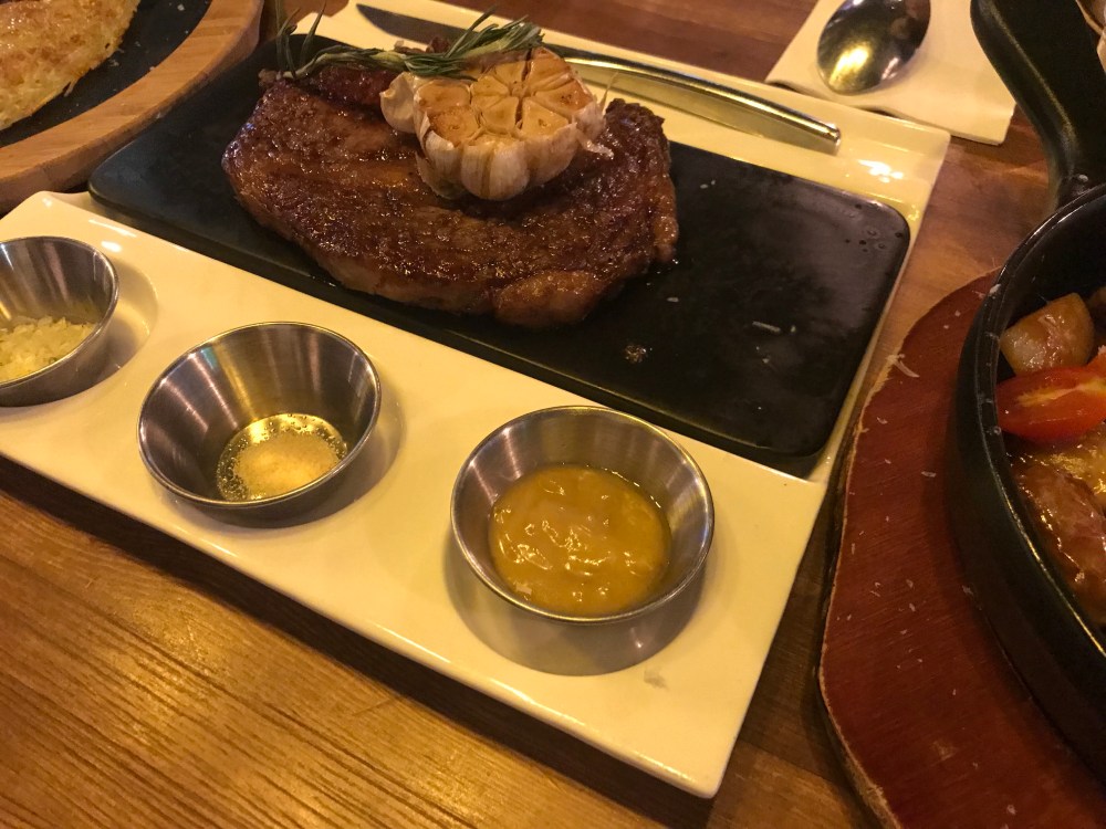 這道好吃的沙朗牛排名為「如果在小每勿島上搭橋」,因為鐵板是熱的,店員推薦我們不要點太熟,所以點了6-7分,送來時鐵板還有熱度熱呼呼的,吃起來口感剛剛好,香嫩又帶點烤味,有三種醬料可以選擇。
