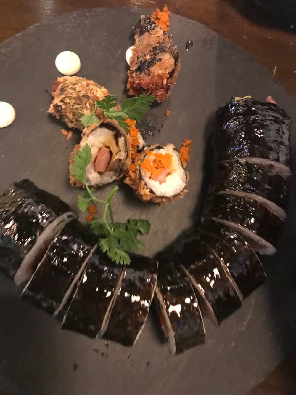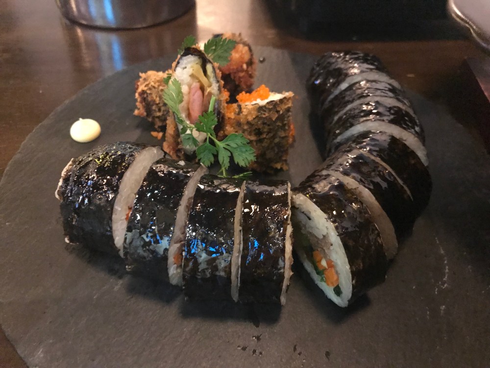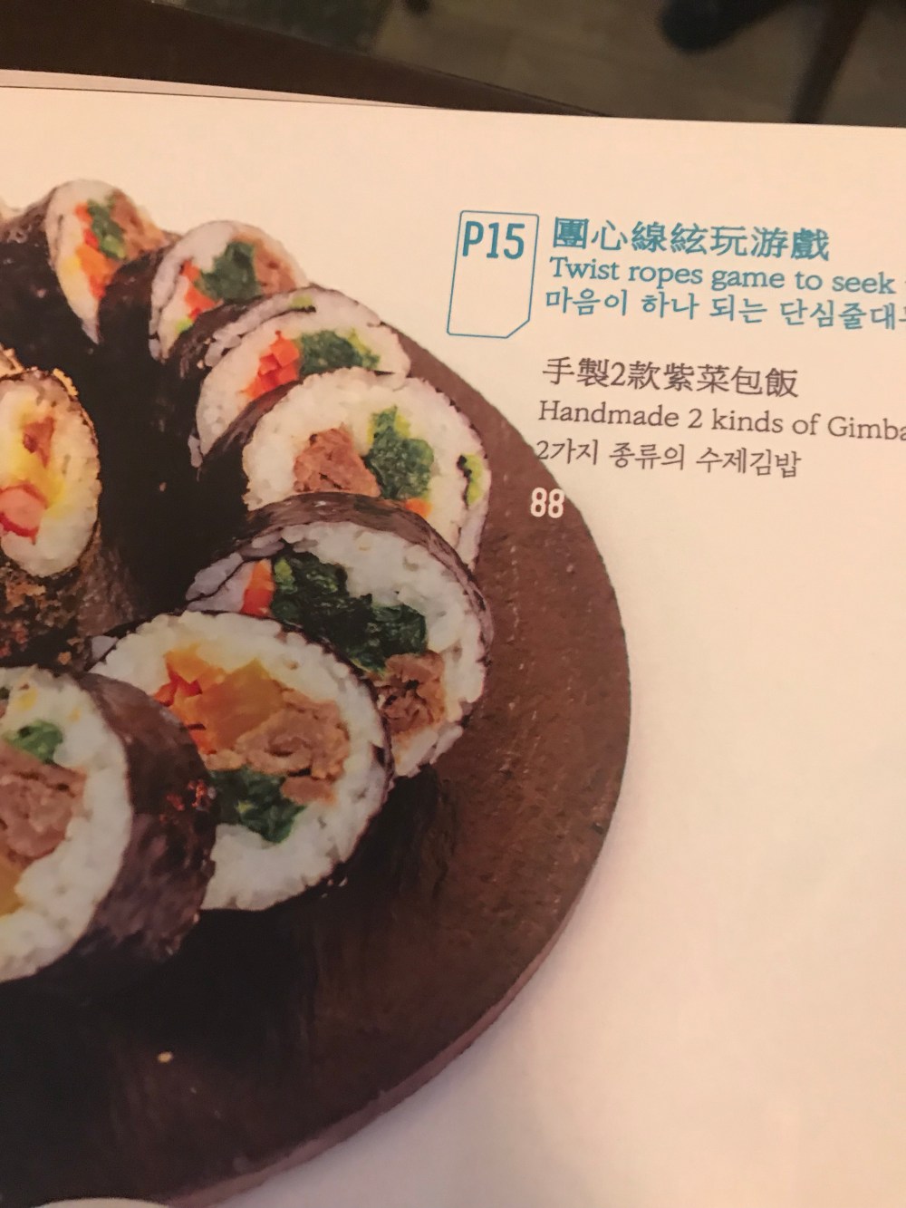 吃韓國菜必點的紫菜包飯,他的名字更讓人會心一笑「團心線絃玩遊戲」,大概就是因為擺盤繞圈圈的模樣吧。