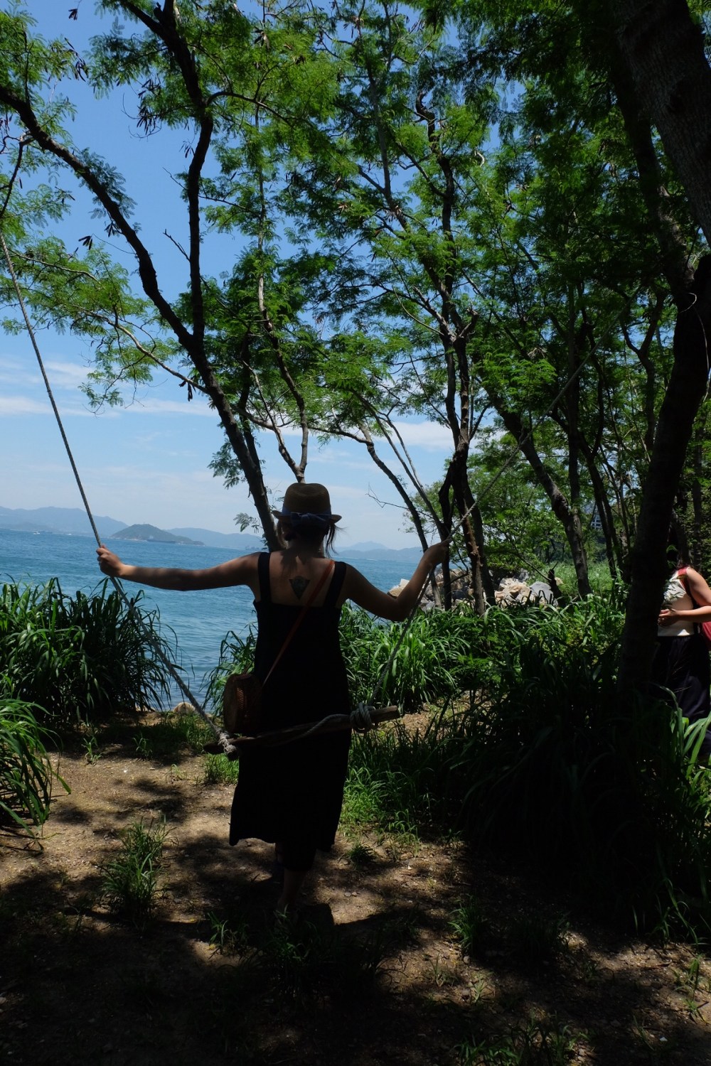 經過提防後是一段看不到盡頭的林蔭散步徑,我們稍微走了一小段,發現靠海的樹林中還有一座超夢幻的鞦韆,太太們玩得不亦樂乎。