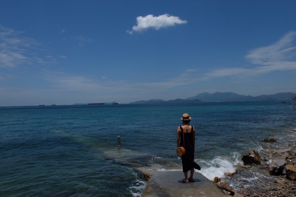 海邊有個像是碼頭的地方,一旁有著類似西貢大澳常見的小船在不遠處釣魚,這裡的沙灘到處是石頭堆疊,走起來有些吃力,浪花時而打上腳邊,清清涼涼。
