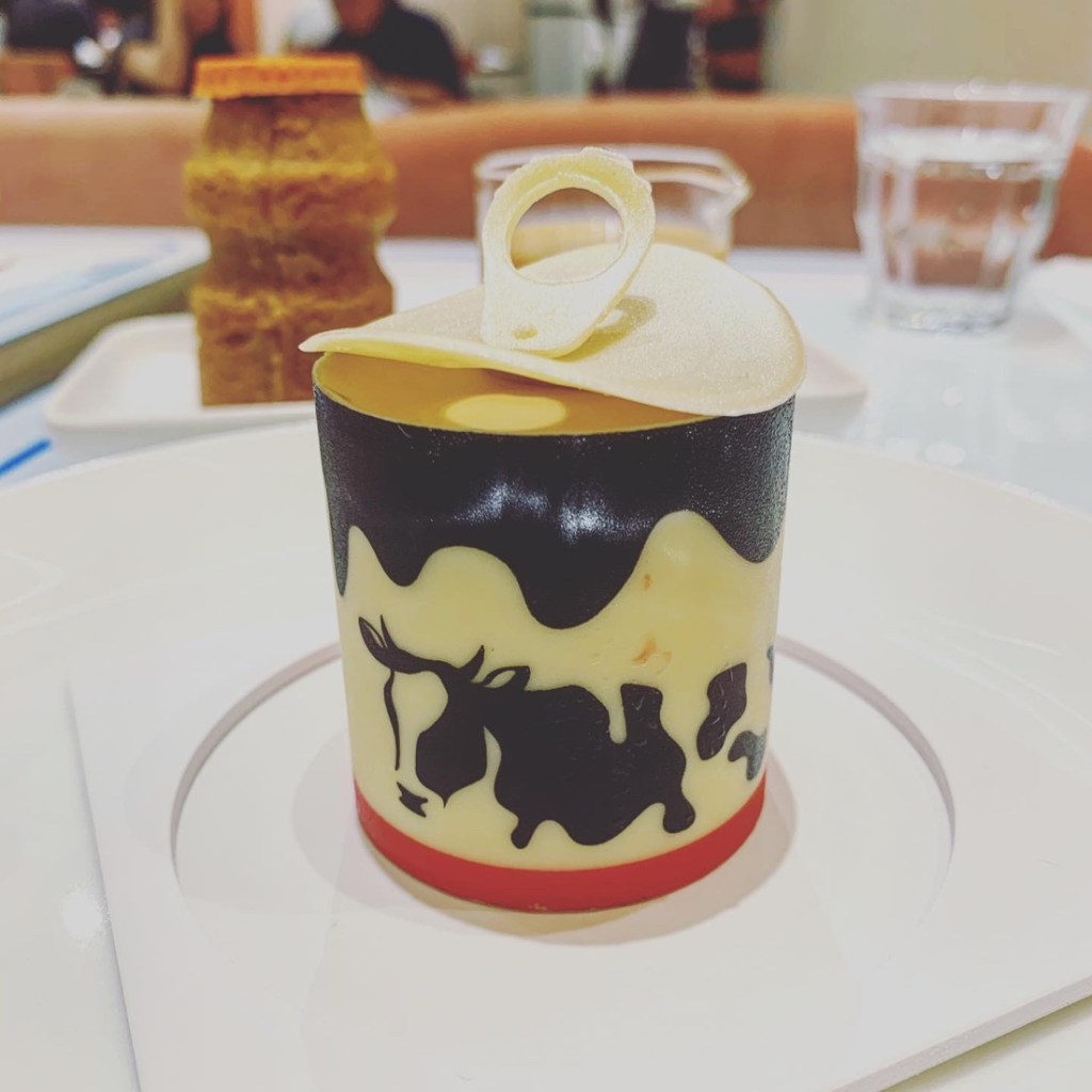 不過雖然有著讓人動心的迷人外表、逼真造型的甜點糖衣,每一片的巧克力都甜度爆表,像是「黑白奶罐 Milk tin panna cotta」與「紙包檸檬茶 Lemon juice box」的瓶身、吸管、拉環,比較適合天生是螞蟻人的深度甜點控,建議不是那麼能吃甜的朋友來的時候可以跟朋友分食或是order 鹹食搭配會更好。