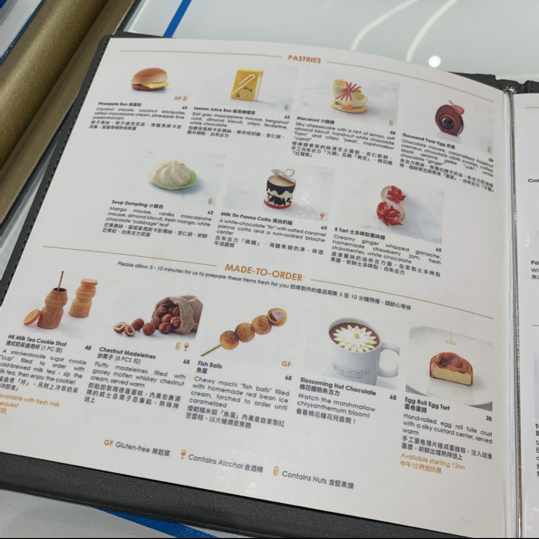 雖然是假日,可能因為翻桌率快,等待了20分鐘左右就入座,但可惜「菠蘿包Pineapple bun 」已經sold out,我們點了「紙包檸檬茶 Lemon juice box」、「黑白奶罐 Milk tin panna cotta」還有「港式奶茶曲奇杯 HK milk tea cookie shot 」。