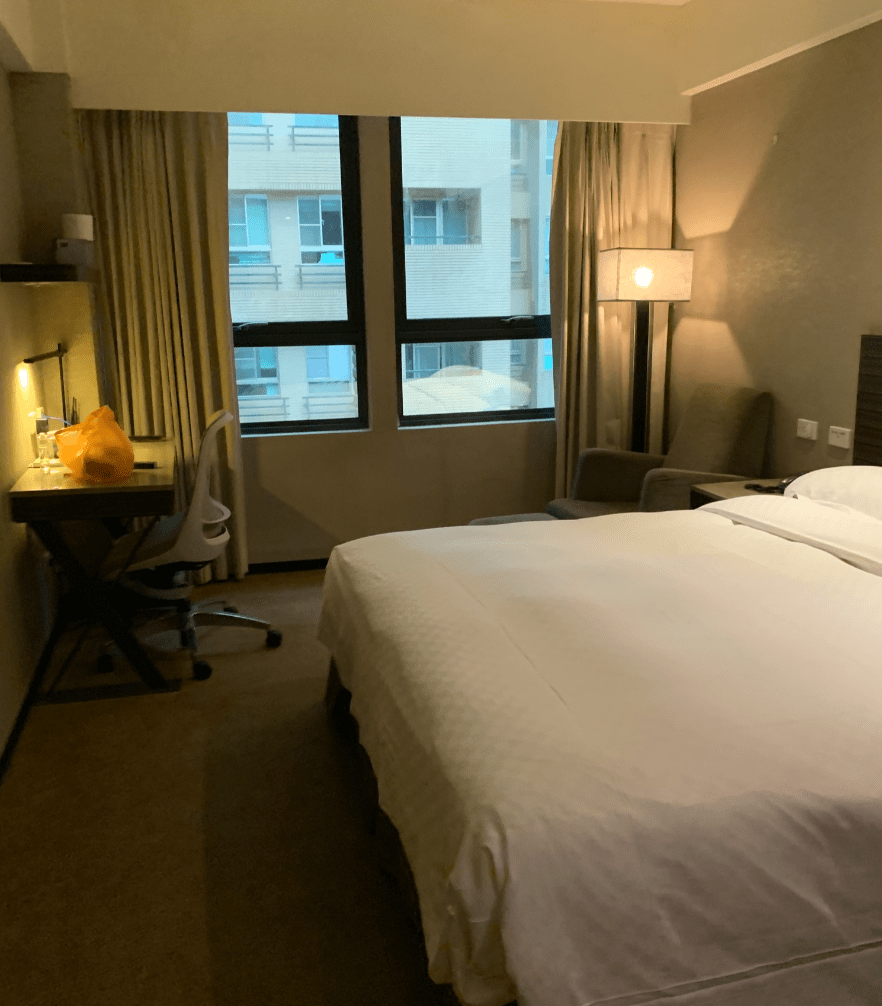 因為大概八月初就確定要回台灣,所以早了一個多月預訂好天閣林森九月底的居家檢疫方案(聽說真的十分熱門,基本上太近期會預約不到),我是在海外直接用Line跟旅館人員聯繫,他們會提供最新的房型價格、包餐與不包餐的方案,然後上面也會註明房型有沒有窗戶、對街景或是對防火巷,因為看了評論整體房間設計偏暗,而且我是要求一定要有對外窗的(至少能看見天氣或看看路人街道),後來我就預訂了「行政房型」,大窗戶也對街景。