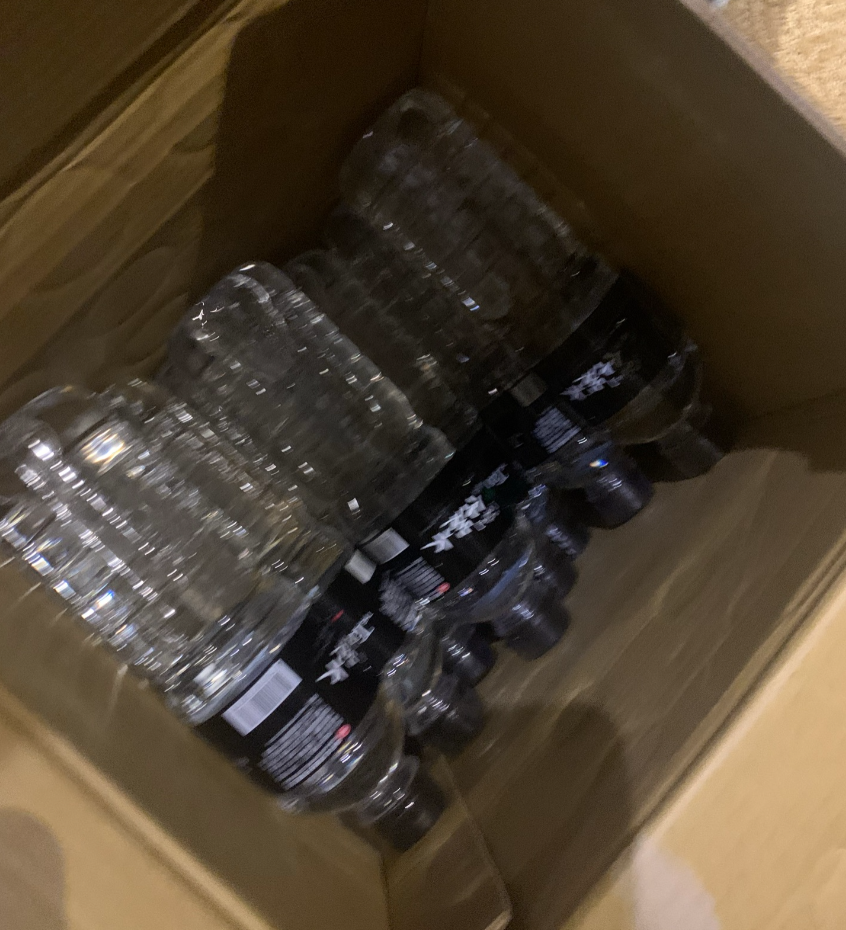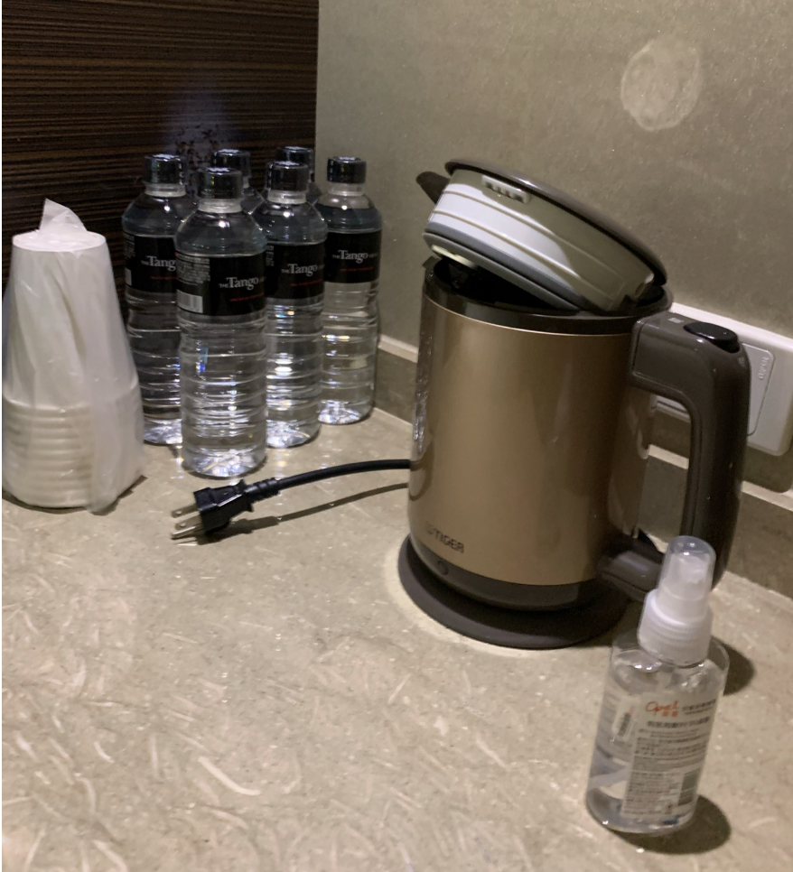 房間有一個小櫃子吧台,上面有熱水快煮壺、紙杯、幾瓶礦泉水,旁邊地上也有一箱,總共飯店是提供30瓶,數量還滿剛好的。
