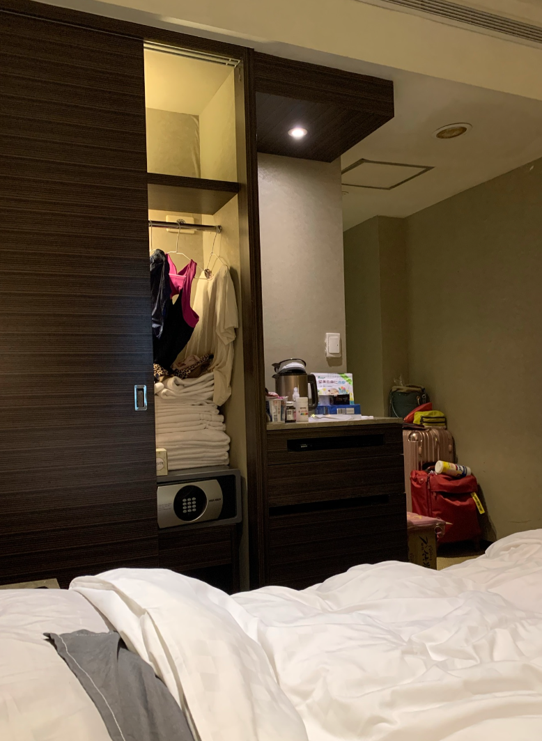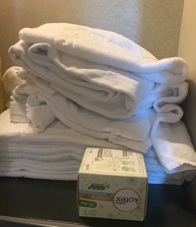 衣櫃有放15天份的毛巾、浴巾,因為是在檢疫期間,更換的毛巾是不能拿出去的,我就折好放在浴缸附近的平台,衛生棉是自備的,剛好會遇上生理期。