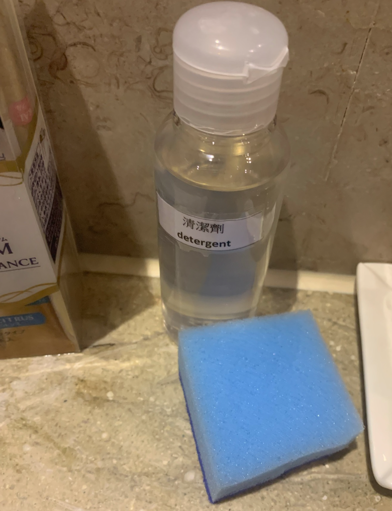 洗手台上面有放15天放的洗髪精、沐浴乳、肥皂等等,最貼心的是還附上洗碗清潔劑跟小塊的菜瓜布,這真的滿需要的,每天都要用來洗環保餐具跟碗。