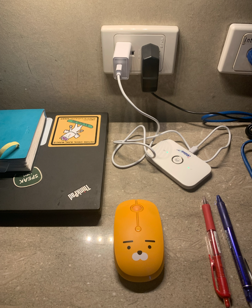 有一個極度黃光的檯燈以外,還貼心有一個專用的router(左),其實網速算滿快的,不過因為公司vpn比較麻煩,所以我主要是用自己租的wifi機(右),以防開會時候網路不穩或斷斷續續。